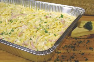 Fettuccini sauteed with ham, then simmered in a cream and cheese sauce. Serves 7-8