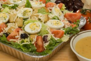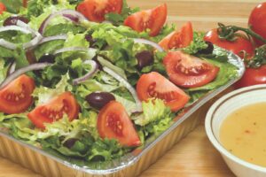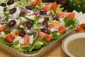 Romaine lettuce, tomatoes, Kalamata olives (may contain pits), green peppers, red onions, feta cheese & Mediterranean dressing