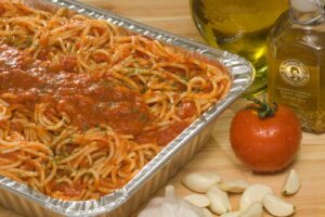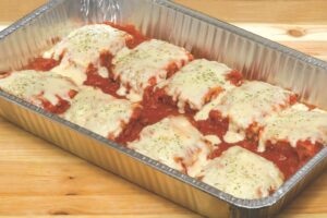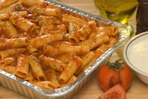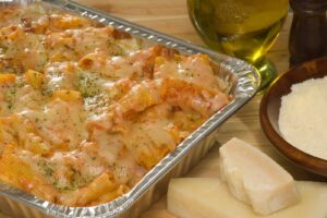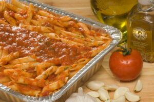 Rigatoni oven baked in a plum tomato sauce & topped with mild cheese. Serves 7-8