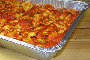 Ravioli filled with proscuitto, cheese, and spinach. Then simmered in a plum tomato sauce. Serves 7-8