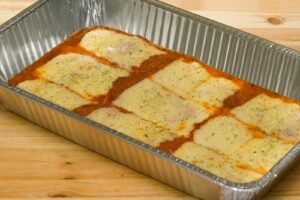 Layered with ground beef, parmesan, romano cheese & topped with melted cheese. Serves 7-8